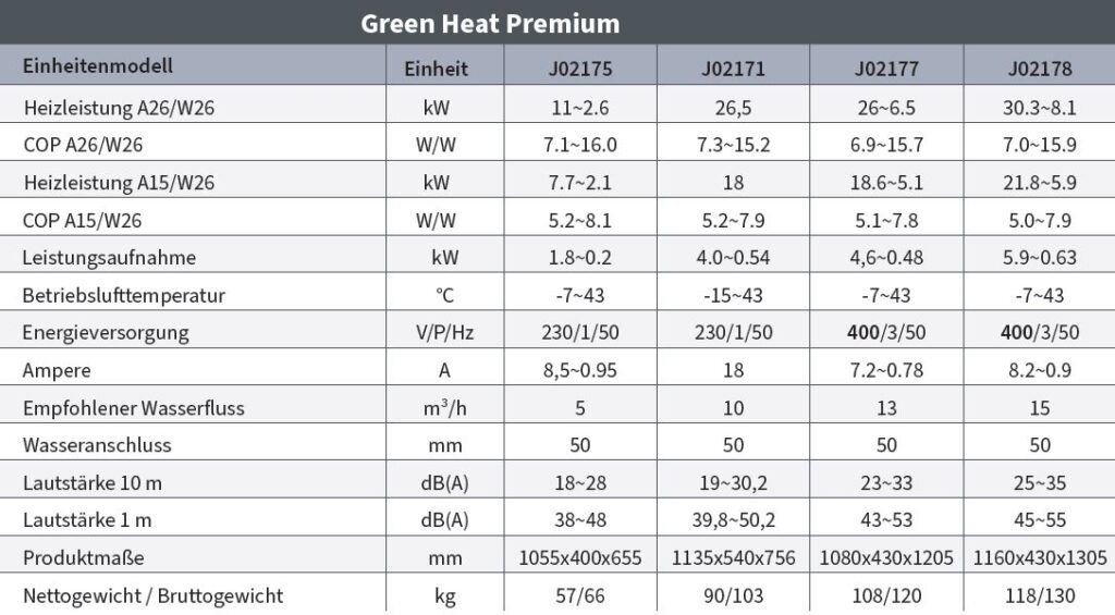 Ein hochwertiges Aluminiumgehäuse verleiht der Wärmepumpe ein modernes Design, während das Touch-Display einfachste Bedienung garantiert. Zusätzlich können Sie die Wärmepumpe mit der dazugehörigen App über Ihr Smartphone steuern. Im Normalbetrieb passt sich die Wärmepumpe an die Umgebungstemperatur an optimiert den Heizkapazität entsprechend der Umgebungstemperatur. Um einen idealen Betrieb zu garantieren, verfügt die Wärmepumpe zusätzlich über einen Boost- sowie über einen Silence Modus. Der Boost-Modus sorgt für maximale Heizkraft, damit Ihre Wunschtemperatur so schnell wie möglich erreicht wird. Im Silence-Modus wird hingegen die Kapazität so gedrosselt, dass die Temperatur aufrecht bleibt, der Geräuschpegel aber auf ein Minimum reduziert ist. Die Wärmepumpe Green Heat Premium arbeitet bis -7 °C und kann somit das ganze Jahr über verwendet werden. Unsere Wärmepumpen sind serienmäßig mit EEV (Elektronischen-Expansions-Ventil) – dies entspricht dem neuesten Stand der Technik – ausgestattet. Dadurch wird der Wirkungsgrad der Wärmepumpe bestmöglich optimiert. Inklusive 3 Jahre vor Ort Garantie (gilt nur für Österreich)!
