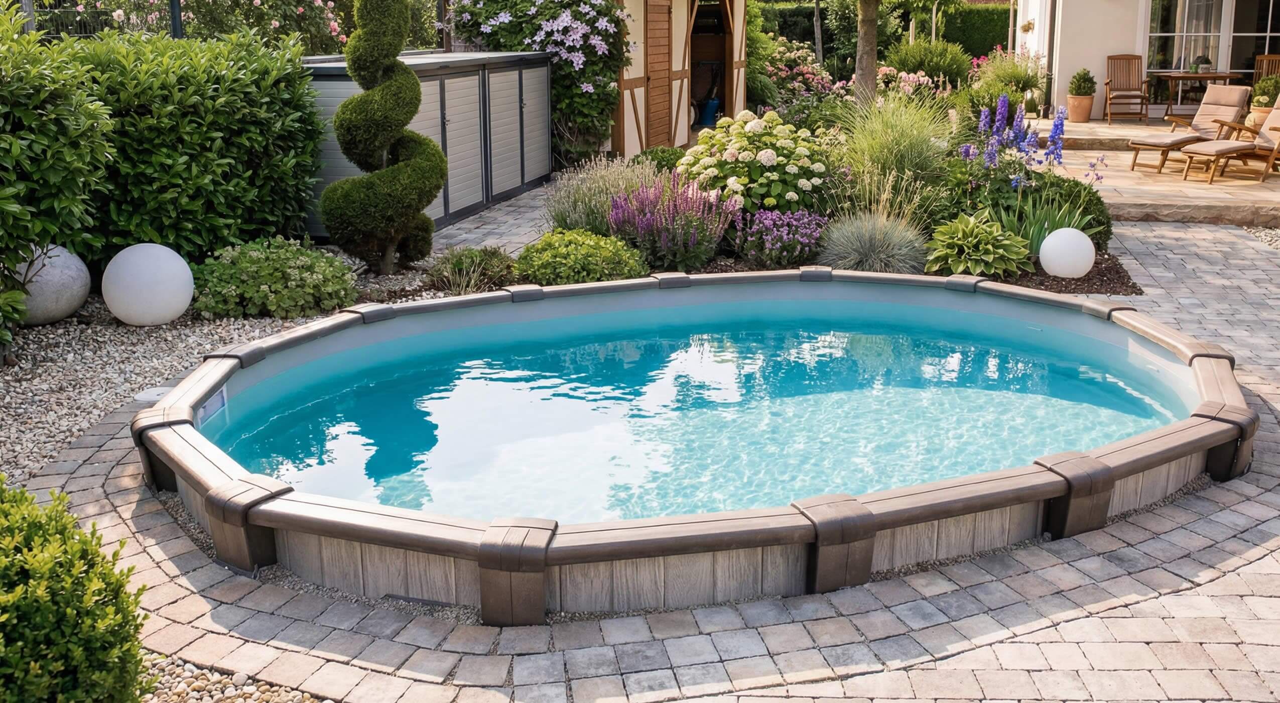 Die massive Beckenkonstruktion und der breite Handlauf ermöglichen einen Einbau ohne seitliche Stützmauern und Betonfundamentplatte. In Verbindung mit dem Pool Partner Isolationsschutz ist sogar ein Einbau komplett ohne Beton möglich. Die graue 0,8 mm Folie sorgt bei Sonneneinstrahlung für eine atemberaubende Wasserfarbe und macht den Pool zum Highlight in Ihrem Garten.